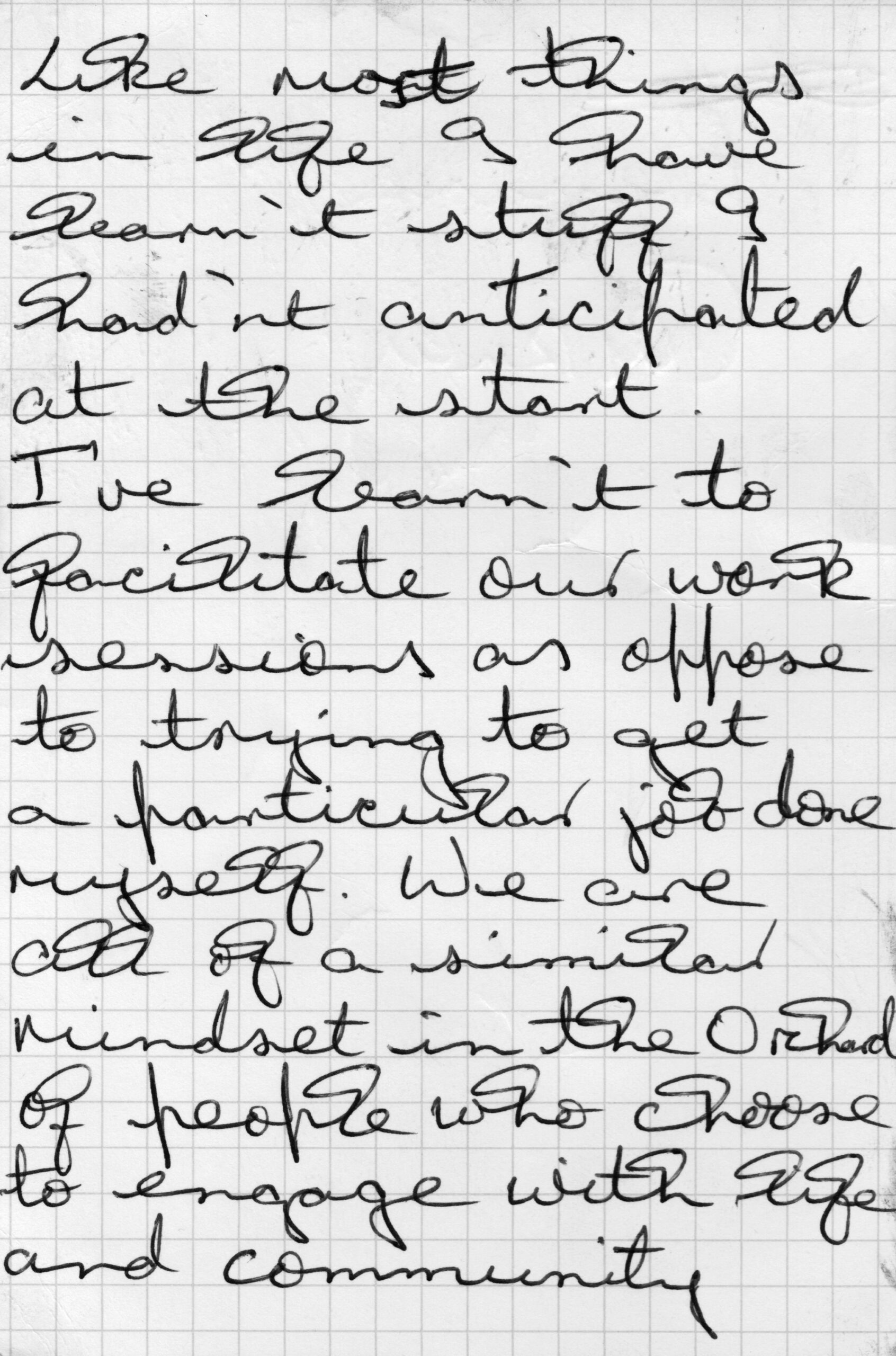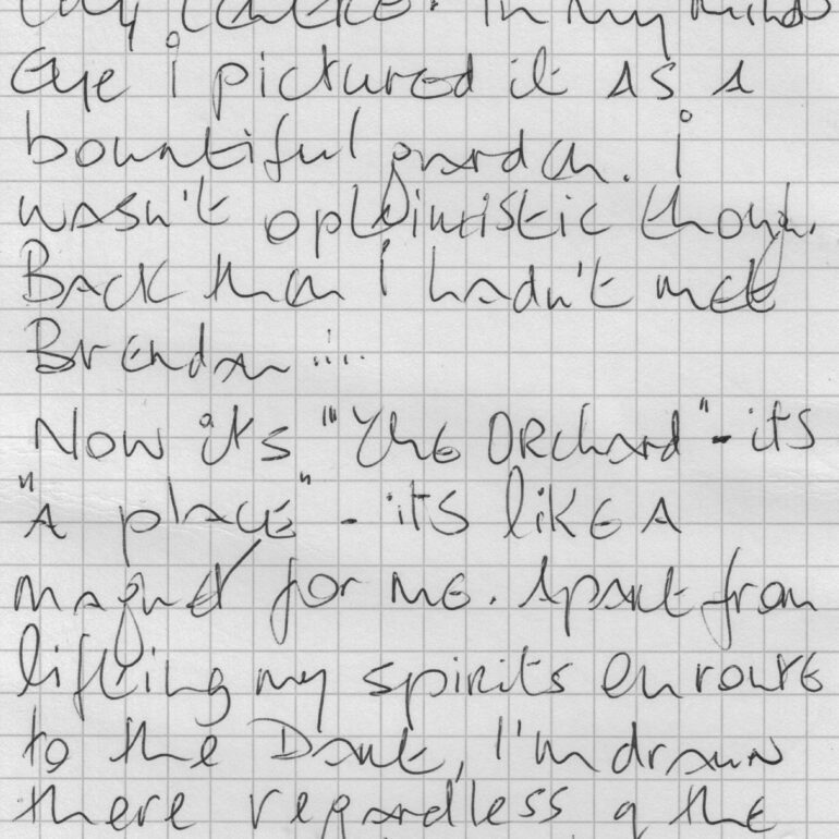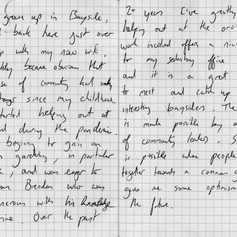 Initially, I gazed broadly and took photographs of the gardeners at work. I took documentary style and portrait photographs of everyone. I felt I wasn’t capturing the depth of the place or its people. The sounds, the energy and the meitheal needed more, so I asked each of the gardeners to write down their personal thoughts on what the garden means to them.